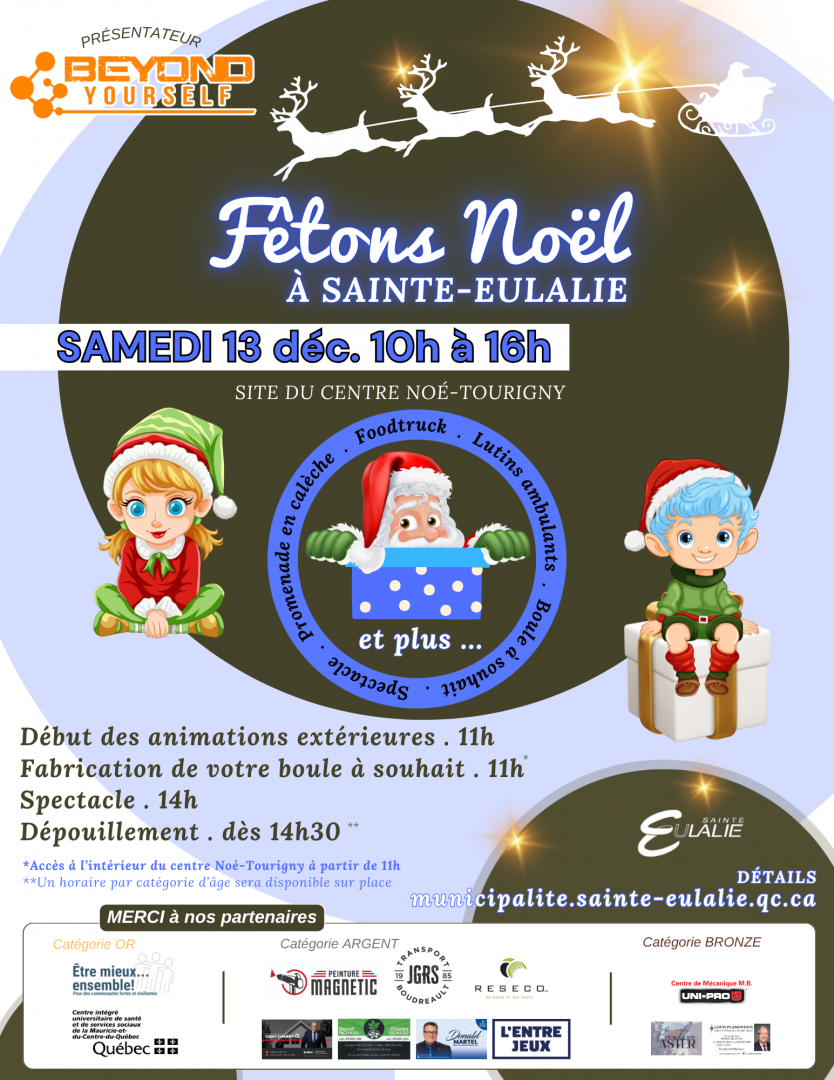 Je tiens à souligner l’importance et l’immense générosité de nos nombreux partenaires qui permettent d’organiser cette journée exceptionnelle et d’offrir les cadeaux gratuitement aux enfants de Sainte‑Eulalie. MERCI DU FOND DU CŒUR à Beyond Yourself, le programme Être mieux ensemble du CIUSSS MCQ, Peinture Magnétic, Humus Sol, Dany Chabot‑Courtier immobilier, Reseco, Transport JGRS Boudreault, Hydraulique Martin, le député provincial Donald Martel, le député fédéral Louis Plamondon, Création Aster et Mécanique MB. Je tiens également à remercier tous les bénévoles qui s’impliqueront au sein de cet événement, qui se veut une tradition pour nos familles.
