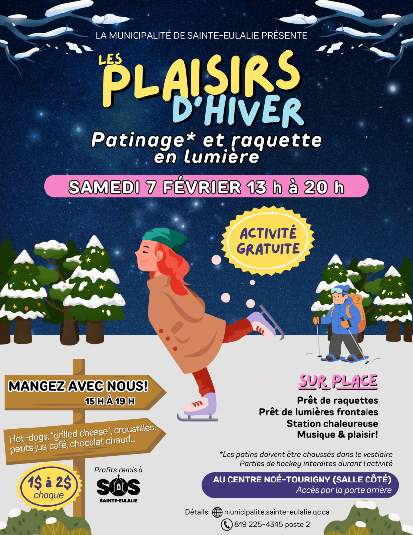 Dans cet esprit, nous sommes heureux de vous inviter à participer à l’événement Les Plaisirs d’hiver de Sainte‑Eulalie, qui se tiendra le samedi 7 février, de 13 h à 20 h, sur le site extérieur du Centre Noé‑Tourigny. Cette activité vise à offrir aux familles et aux citoyens une occasion privilégiée de bouger, de se rassembler et de célébrer l’hiver dans une ambiance chaleureuse et festive.