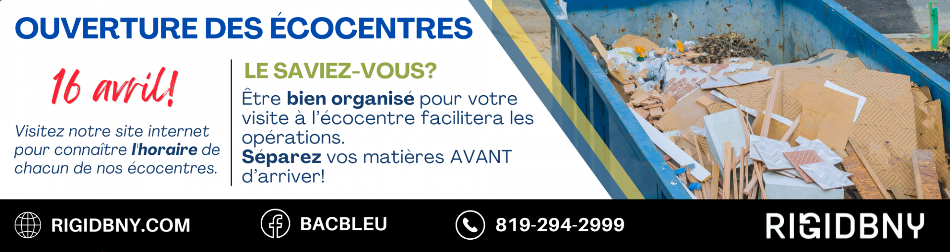 Avec l’arrivée du beau temps, nous sommes heureux d’annoncer la réouverture de l’écocentre à compter du jeudi 16 avril. Celui‑ci sera accessible selon l’horaire habituel, soit le jeudi de 13 h à 19 h ainsi que le vendredi et le samedi de 9 h à 15 h. Nous vous invitons à en profiter pour disposer adéquatement de vos matières.
